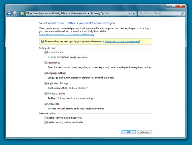 The feature, which appears to be only available for “Linked” Windows accounts (presumably to Windows Live), allows for users to “roam” to different computers and devices (*cough* Windows Phone) with their various settings and configurations, automagically applied.