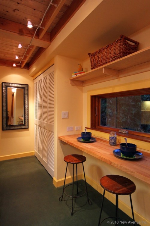 Attached to the living area and kitchen would be a small dining / office nook, though I think I’ll set up my printer table desk and nice office chair in the living room space, it is a simple way to seat two people to eat together and because of the close proximity, anyone eating in the living room or office space would still be able to be part of the conversation and interact with those dining at the nook.