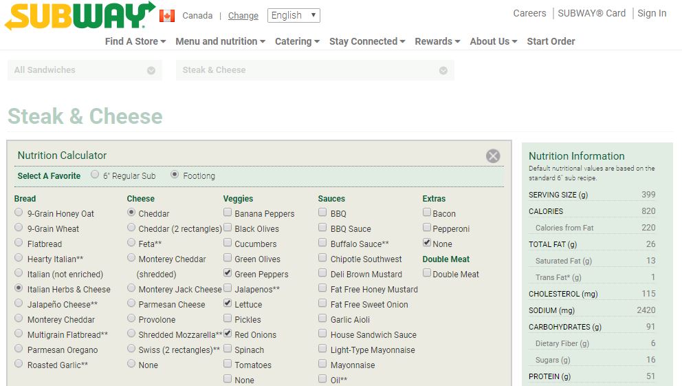 My steak and cheese sub with the same toppings isn’t much better at 820 calories. At least it will allow me enough calories to have an iced tea or other low calorie flavoured drink with the meal.