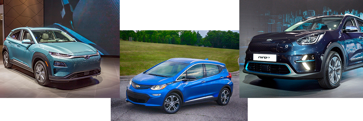 The three vehicles in true contention would have to be the Hyundai Kona Electric, Chevrolet Bolt EV, and the Kia Niro EV .