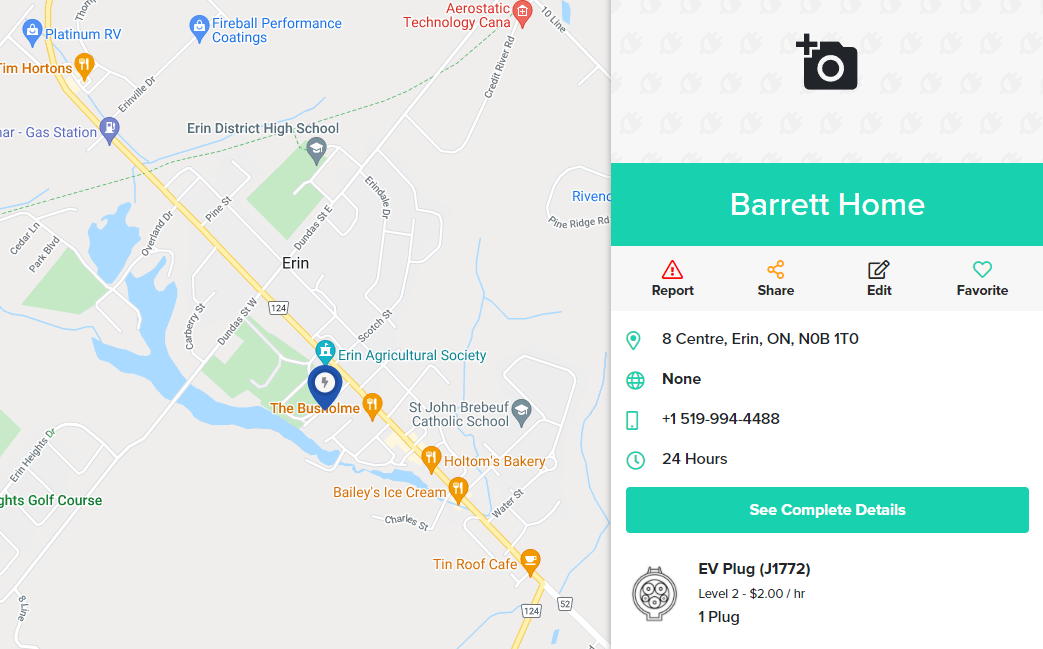 Currently, the only charger in Erin is a single plug, level two charger that I estimate will charge at a rate of around 20 KM per hour of use. This would provide us with some options and flexibility while we are in town.